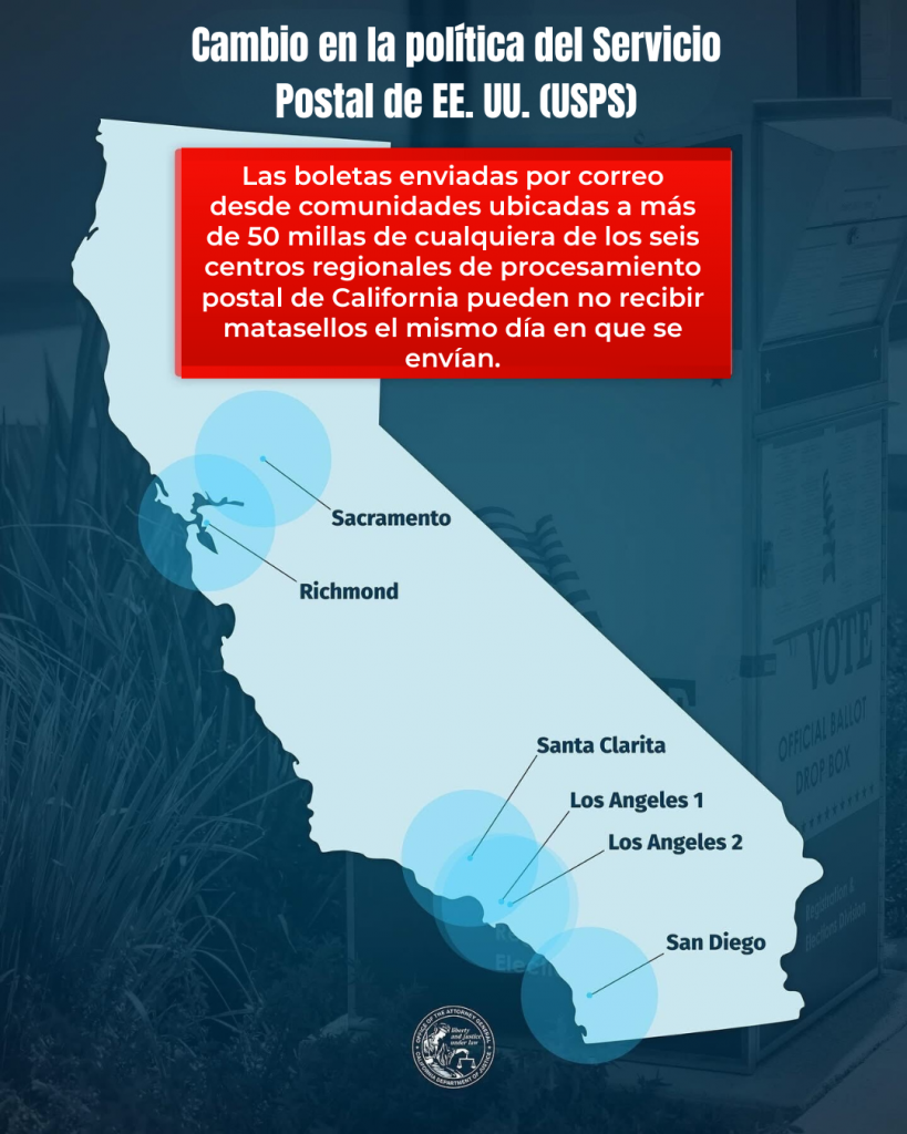 Debido a los cambios recientes del Servicio Postal de EE.UU. (USPS), si una comunidad está a más de 50 millas aproximadamente de un centro de procesamiento del correo regional, puede ser que las balotas enviadas el Día de las Elecciones no reciban un matasello del mismo día y por lo tanto pueden ser rechazadas. (Según lo anunciado por el Fiscal General Rob Bonta)