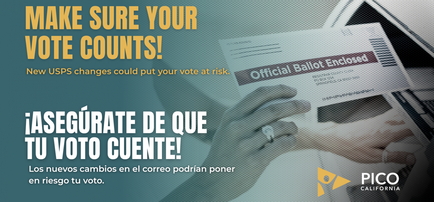 Debido a los cambios recientes del Servicio Postal de EE.UU. (USPS), si una comunidad está a más de 50 millas aproximadamente de un centro de procesamiento del correo regional, puede ser que las balotas enviadas el Día de las Elecciones no reciban un matasello del mismo día y por lo tanto pueden ser rechazadas. (Según lo anunciado por el Fiscal General Rob Bonta)